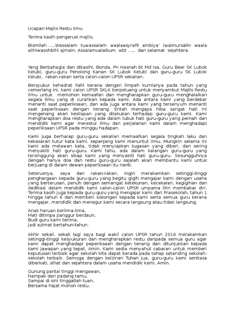 Teks Ucapan Wakil Murid Majlis Restu Ilmu Pdf